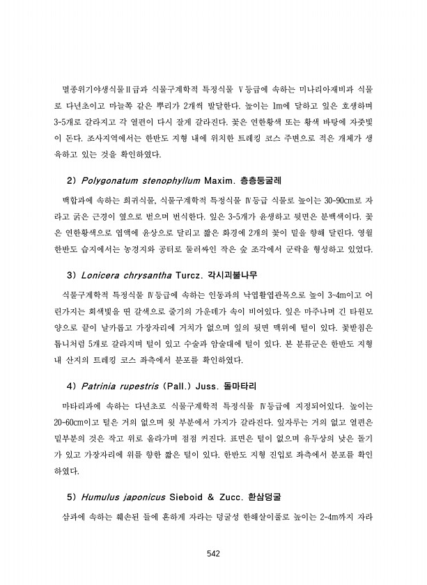 542 멸종위기야생식물Ⅱ급과 식물구계학적 특정식물 Ⅴ등급에 속하는 미나리아재비과 식물 로 다년초이고 마늘쪽 같은 뿌리가 2개씩 발달한다. 높이는 1m에 달하고 잎은 호생하며 3-5개로 갈라지고 각 열편이 다시 잘게 갈라진다. 꽃은 연한황색 또는 황색 바탕에 자줏빛 이 돈다. 조사지역에서는 한반도 지형 내에 위치한 트레킹 코스 주변으로 적은 개체가 생 육하고 있는 것을 확인하였다. 2 Polygonatum stenophyllum Maxim. 층층둥굴레 백합과에 속하는 희귀식물, 식물구계학적 특정식물 Ⅳ등급 식물로 높이는 30-90cm로 자 라고 굵은 근경이 옆으로 벋으며 번식한다. 잎은 3-5개가 윤생하고 뒷면은 분백색이다. 꽃 은 연한황색으로 엽액에 윤상으로 달리고 짧은 화경에 2개의 꽃이 밑을 향해 달린다...