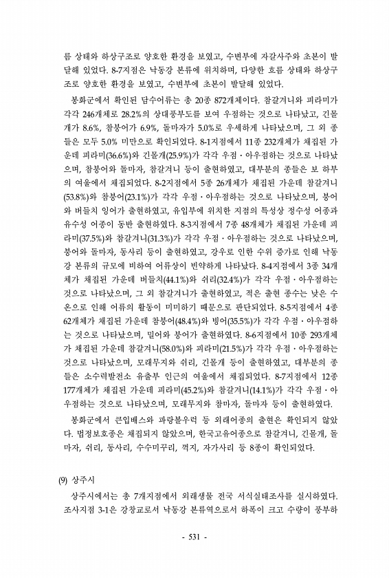 름 상태와 하상구조로 양호한 환경을 보였고, 수변부에 자갈사주와 초본이 발 달해 있었다. 8-7지점은 낙동강 본류에 위치하며, 다양한 흐름 상태와 하상구 조로 양호한 환경을 보였고, 수변부에 초본이 발달해 있었다. 봉화군에서 확인된 담수어류는 총 20종 872개체이다. 참갈겨니와 피라미가 각각 246개체로 28.2%의 상대풍부도를 보여 우점하는 것으로 나타났고, 긴몰 개가 8.6%, 참붕어가 6.9%, 돌마자가 5.0%로 우세하게 나타났으며, 그 외 종 들은 모두 5.0% 미만으로 확인되었다. 8-1지점에서 11종 232개체가 채집된 가 운데 피라미 36.6% 와 긴몰개 25.9% 가 각각 우점?아우점하는 것으로 나타났 으며, 참붕어와 돌마자, 참갈겨니 등이 출현하였고, 대부분의 종들은 보 하부 의 여울에서...