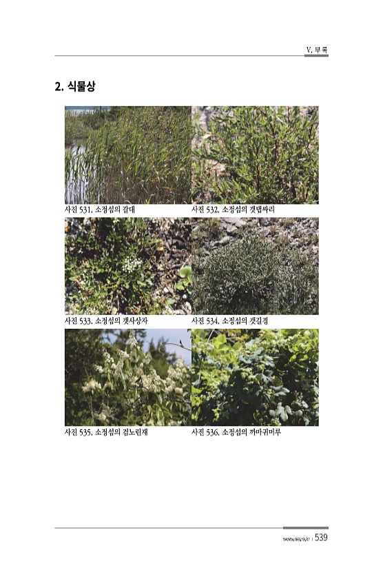 V. 부 록 www.nie.re.kr ?539 2. 사진 531. 소정섬의 갈대 사진 532. 소정섬의 갯댑싸리 사진 533. 소정섬의 갯사상자 사진 534. 소정섬의 갯길경 사진 535. 소정섬의 검노린재 사진 536. 소정섬의까마귀머루
