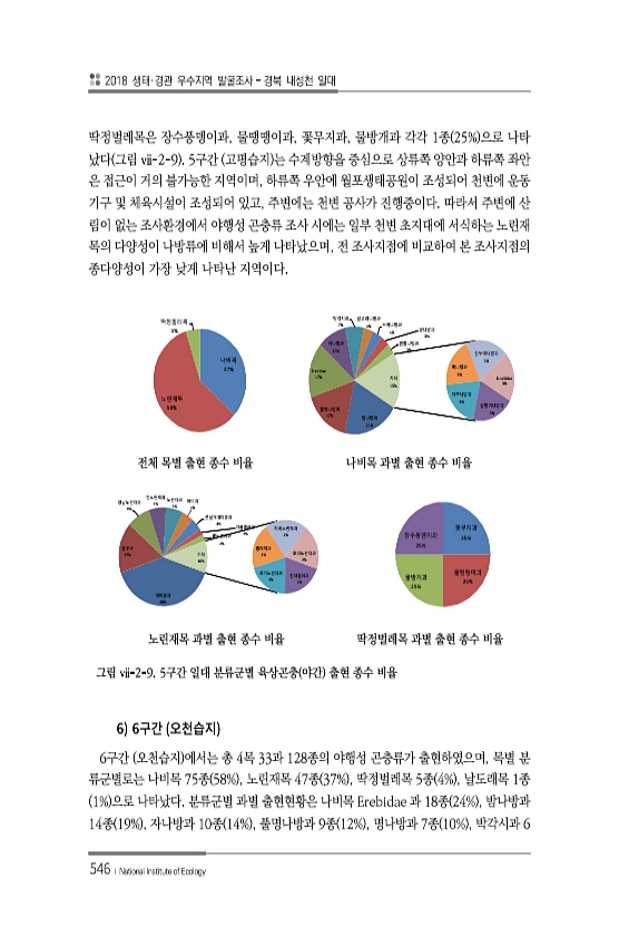 2018 생태·경관 우수지역 발굴조사 경북 내성천 일대 546 ? National Institute of Ecology 딱정벌레목은 장수풍뎅이과, 물땡땡이과, 꽃무지과, 물방개과 각각 1종 25% 으로 나타 났다 그림 ⅶ-2-9 5구간 고평습지 는 수계방향을 중심으로 상류쪽 양안과 하류쪽 좌안 은 접근이 거의 불가능한 지역이며, 하류쪽 우안에 월포생태공원이 조성되어 천변에 운동 기구 및 체육시설이 조성되어 있고, 주변에는 천변 공사가 진행중이다. 따라서 주변에 산 림이 없는 조사환경에서 야행성 곤충류 조사 시에는 일부 천변 초지대에 서식하는 노린재 목의 다양성이 나방류에 비해서 높게 나타났으며, 전 조사지점에 비교하여 본 조사지점의 종다양성이 가장 낮게 나타난 지역이다. 나비목 37% 노린재목 58% 딱정벌...