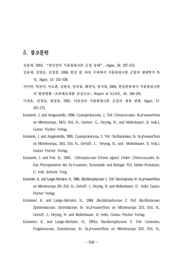 530 김용재, 2003, “영산강의 식물플랑크톤 군집 동태”, Algae, 18207-215. 김용재 김명운 김상종 한강 중 하류 수계에서 식물플랑크톤 군집의 생태학적 특 , , , 1998, , 성, Algae, 13331-338. 서미연 박잔아 이도훈 김현상 임귀철 배경석 엄석원 한강본류에서 식물플랑크톤 , , , , , , , 2009, 의 발생현황 조류예보제를 중심으로-, Report of S.I.H.E., 45189-201. ? 이정호 권정남 양상용 낙동강의 식물플랑크톤 군집의 계절 변화 , , , 2002, , Algae, 17267-273. Komarek, J. and Anagnostidis, 1998, Cyanoprokaryota. 1. TeilChroococcalesS wasserflora...