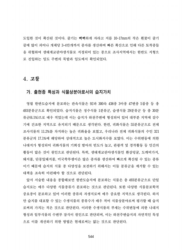 544 도입한 것이 확산된 것이다. 줄기는 빽빽하게 자라고 지름 10-17mm의 작은 흰꽃이 줄기 끝에 많이 피어나 개체당 3-4만개까지 종자를 생산하며 빠른 확산으로 인해 다른 토착종들 을 위협하여 생태계교란야생식물로 지정되어 있는 종으로 조사지역에서는 한반도 지형으 로 진입하는 임도 주변의 묵밭과 임도에서 확인되었다. 4. 고찰 가. 출현종 특성과 식물상분야로서의 습지가치 영월 한반도습지에 분포하는 관속식물은 92과 300속 438종 3아종 47변종 5품종 등 총 493분류군으로 확인되었다. 습지식물은 정수식물 1분류군, 습생식물 29분류군 등 총 30분 류군 6.1% 으로 매우 적었는데 이는 습지가 하천주변에 형성되어 있어 대부분 지역에 갈수 기에 건조한 지역으로 유지되기 때문으로 생각된다. 한편, 귀...
