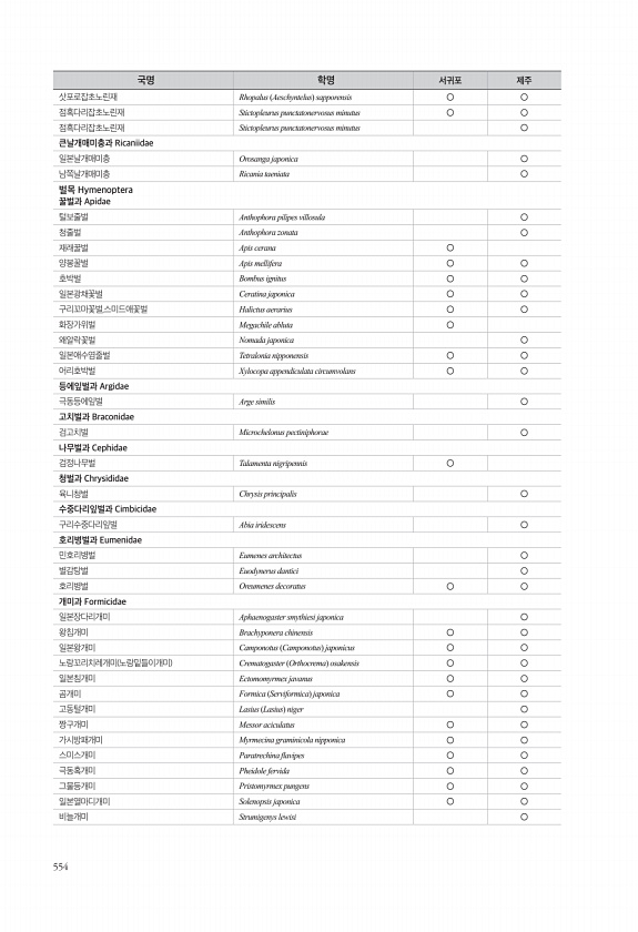 554 삿포로잡초노린재 Rhopalus Aeschyntelus sapporensis ○ ○ 점혹다리잡초노린재 Stictopleurus punctatonervosus minutus ○ ○ 점흑다리잡초노린재 Stictopleurus punctatonervosus minutus ○ 큰날개매미충과 Ricaniidae 일본날개매미충 Orosanga japonica ○ 남쪽날개매미충 Ricania taeniata ○ 벌목 Hymenoptera 꿀벌과 Apidae 털보줄벌 Anthophora pilipes villosula ○ 청줄벌 Anthophora zonata ○ 재래꿀벌 Apis cerana ○ 양봉꿀벌 Apis mellifera ○ ○ 호박벌 Bombus ignitus ○ ○ 일본광채꽃벌 Ceratina jap...