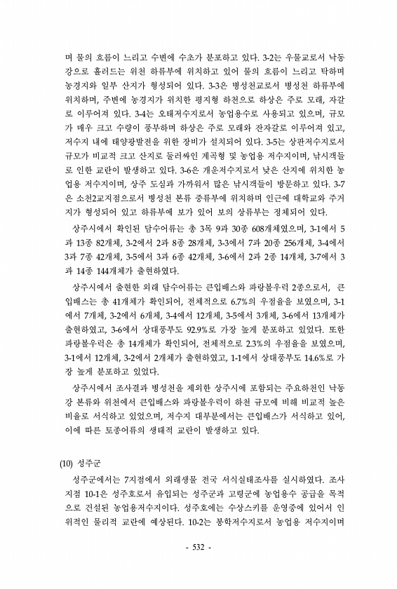 며 물의 흐름이 느리고 수변에 수초가 분포하고 있다. 3-2는 우물교로서 낙동 강으로 흘러드는 위천 하류부에 위치하고 있어 물의 흐름이 느리고 탁하며 농경지와 일부 산지가 형성되어 있다. 3-3은 병성천교로서 병성천 하류부에 위치하며, 주변에 농경지가 위치한 평지형 하천으로 하상은 주로 모래, 자갈 로 이루어져 있다. 3-4는 오태저수지로서 농업용수로 사용되고 있으며, 규모 가 매우 크고 수량이 풍부하며 하상은 주로 모래와 잔자갈로 이루어져 있고, 저수지 내에 태양광발전을 위한 장비가 설치되어 있다. 3-5는 상판저수지로서 규모가 비교적 크고 산지로 둘러싸인 계곡형 및 농업용 저수지이며, 낚시객들 로 인한 교란이 발생하고 있다. 3-6은 개운저수지로서 낮은 산지에 위치한 농 업용 저수지이며, 상주 도심과 가...