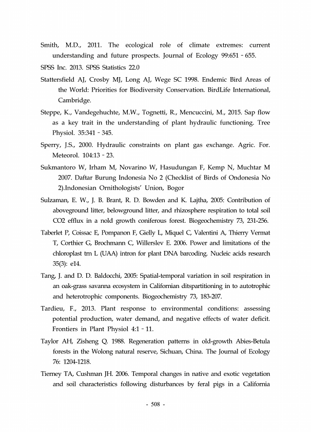 508 Smith, M.D., 2011. The ecological role of climate extremescurrent understanding and future prospects. Journal of Ecology 99651?655. SPSS Inc. 2013. SPSS Statistics 22.0 Stattersfield AJ, Crosby MJ, Long AJ, Wege SC 1998. Endemic Bird Areas of the WorldPriorities for Biodiversity Conservation. BirdLife International, Cambridge. Steppe, K., Vandegehuchte, M.W., Tognetti, R., Mencuccini, M., 2015...