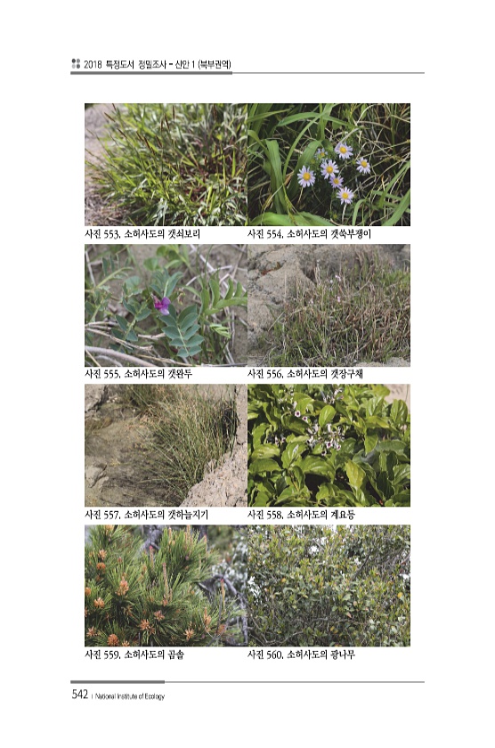 2018 특정도서 정밀조사 신안 1 북부권역 542 ? National Institute of Ecology 사진 553. 소허사도의 갯쇠보리 사진 554. 소허사도의 갯쑥부쟁이 사진 555. 소허사도의 갯완두 사진 556. 소허사도의 갯장구채 사진 557. 소허사도의 갯하늘지기 사진 558. 소허사도의 계요등 사진 559. 소허사도의 곰솔 사진 560. 소허사도의광나무