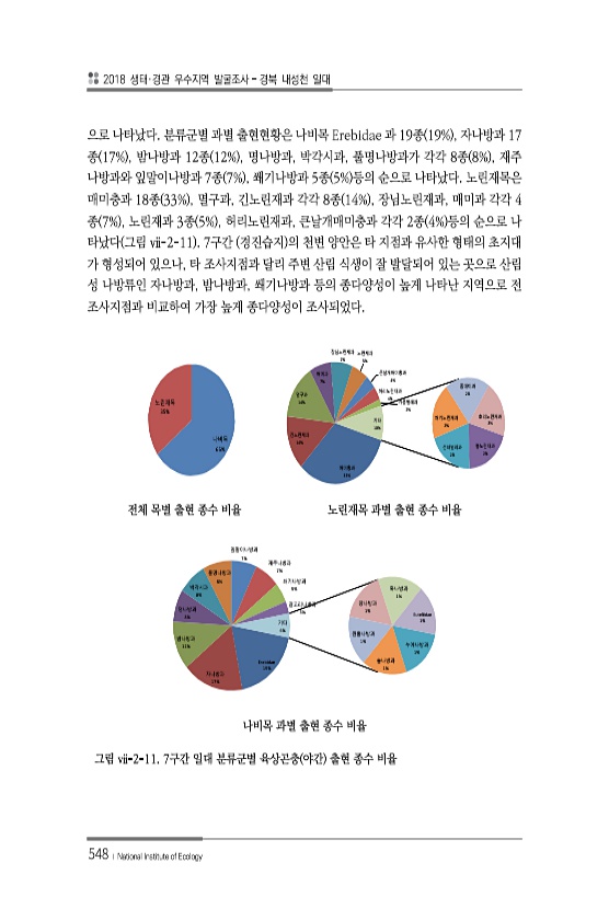 2018 생태·경관 우수지역 발굴조사 경북 내성천 일대 548 ? National Institute of Ecology 으로 나타났다. 분류군별 과별 출현현황은 나비목 Erebidae 과 19종 19% , 자나방과 17 종 17% , 밤나방과 12종 12% , 명나방과, 박각시과, 풀명나방과가 각각 8종 8% , 재주 나방과와 잎말이나방과 7종 7% , 쐐기나방과 5종 5% 등의 순으로 나타났다. 노린재목은 매미충과 18종 33% , 멸구과, 긴노린재과 각각 8종 14% , 장님노린재과, 매미과 각각 4 종 7% , 노린재과 3종 5% , 허리노린재과, 큰날개매미충과 각각 2종 4% 등의 순으로 나 타났다 그림 ⅶ-2-11 7구간 경진습지 의 천변 양안은 타 지점과 유사한 형태의 초지대 가 형성되어 있으나,...