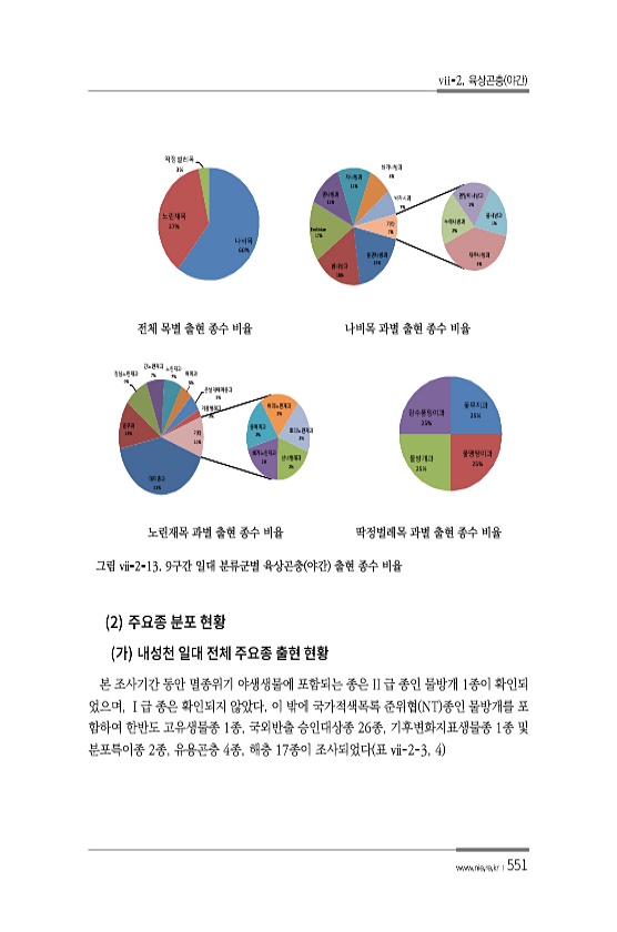 vii-2. 육상곤충 야간 www.nie.re.kr ?551 나비목 60% 노린재목 37% 딱정벌레목 3% 풀명나방과 19% 밤나방과 18% Erebidae 17% 명나방과 12% 자나방과 12% 쐐기나방과 8% 박각시과 7% 재주나방과 3% 누에나방과 2% 잎말이나방과 1% 불나방과 기타 1% 7% 전체 목별 출현 종수 비율 나비목 과별 출현 종수 비율 매미충과 41% 멸구과 14% 장님노린재과 9% 긴노린재과 7% 노린재과 7% 매미과 5% 큰날개매미충과 5% 거품벌레과 2% 선녀벌레과 2% 쐐기노린재과 2% 좀매미과 2% 허리노린재과 2% 호리노린재과 2% 기타 10% 꽃무지과 25% 물땡땡이과 25% 물방개과 25% 장수풍뎅이과 25% 노린재목 과별 출현 종수 비율 딱정벌레목 과별 출현 종수 비율 그...