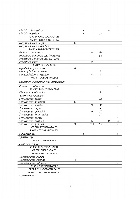 535 Ulothrix subconstricta + + Ulothrix tenerrima + 13 ORDER CHLOROCOCCALES FAMILY BOTRYOCOCCACEAE Dictyosphaerium elegans 17 Dictyosphaerium pulchellum + FAMILY HYDRODICTYACEAE Pediastrum boryanum + 374 Pediastrum boryanum var. longicorne 34 Pediastrum boryanum var. brevicone + Pediastrum tetras 34 FAMILY OOCYSTACEAE Lagerheimia genevensis 4 Monoraphidium arcuatum 4 Monoraphidium contortum 4 4 FA...