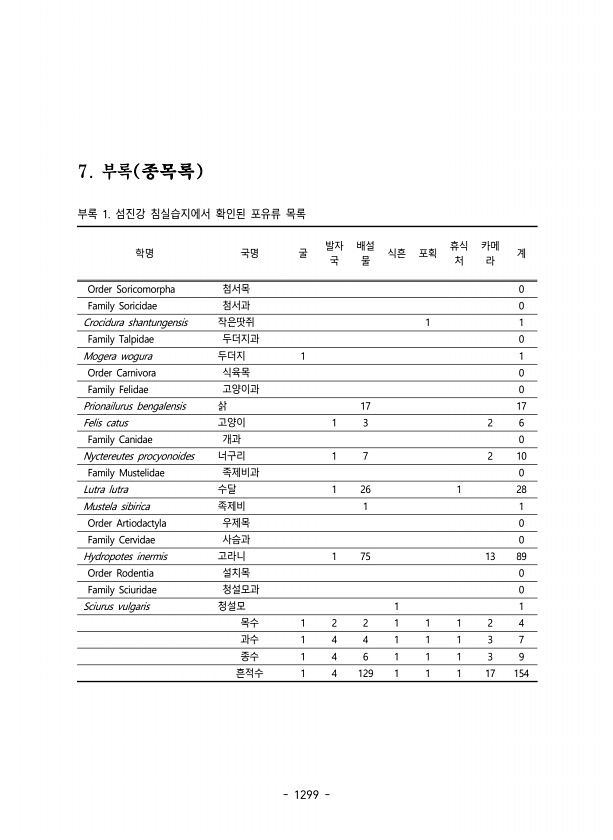 1299 7. 부록 종목록 부록 1. 섬진강 침실습지에서 확인된 포유류 목록 학명 국명 굴 발자 국 배설 물 식흔 포획 휴식 처 카메 라 계 Order Soricomorpha 첨서목 0 Family Soricidae 첨서과 0 Crocidura shantungensis 작은땃쥐 1 1 Family Talpidae 두더지과 0 Mogera wogura 두더지 1 1 Order Carnivora 식육목 0 Family Felidae 고양이과 0 Prionailurus bengalensis 삵 17 17 Felis catus 고양이 1 3 2 6 Family Canidae 개과 0 Nyctereutes procyonoides 너구리 1 7 2 10 Family Mustelidae 족제비과 0 Lutra lutra...