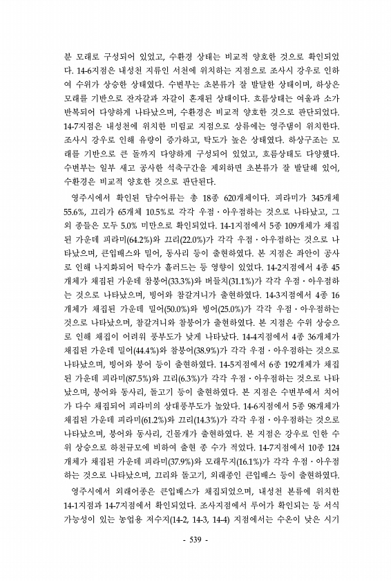 분 모래로 구성되어 있었고, 수환경 상태는 비교적 양호한 것으로 확인되었 다. 14-6지점은 내성천 지류인 서천에 위치하는 지점으로 조사시 강우로 인하 여 수위가 상승한 상태였다. 수변부는 초본류가 잘 발달한 상태이며, 하상은 모래를 기반으로 잔자갈과 자갈이 혼재된 상태이다. 흐름상태는 여울과 소가 반복되어 다양하게 나타났으며, 수환경은 비교적 양호한 것으로 판단되었다. 14-7지점은 내성천에 위치한 미림교 지점으로 상류에는 영주댐이 위치한다. 조사시 강우로 인해 유량이 증가하고, 탁도가 높은 상태였다. 하상구조는 모 래를 기반으로 큰 돌까지 다양하게 구성되어 있었고, 흐름상태도 다양했다. 수변부는 일부 새고 공사한 석축구간을 제외하면 초본류가 잘 발달해 있어, 수환경은 비교적 양호한 것으로 판단된다. 영주...