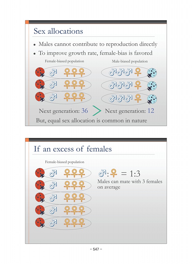 If an excess of females Female-biased population = 13 Males can mate with 3 females on average Sex allocations ? Males cannot contribute to reproduction directly ? To improve growth rate, female-bias is favored Female-biased population Male-biased population Next generation36 Next generation12 But, equal sex allocation is common in nature 547