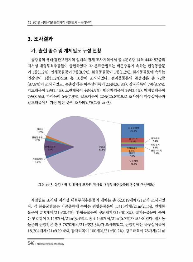 2018 생태·경관보전지역 정밀조사 동강유역 548 ? National Institute of Ecology 3. 동강유역 생태?경관보전지역 일대의 전체 조사지역에서 총 4문 6강 14목 44과 82종의 저서성 대형무척추동물이 출현하였다. 각 분류군별로는 비곤충류에 속하는 편형동물문 이 1종 1.2% , 연체동물문이 7종 8.5% , 환형동물문이 1종 1.2% , 절지동물문에 속하는 연갑강이 1종 1.2% 으로 총 10종이 조사되었다. 절지동물문의 곤충강은 총 72종 87.8% 이 조사되었고, 곤충강에는 하루살이목이 22종 26.8% , 잠자리목이 7종 8.5% , 강도래목이 2종 2.4% , 노린재목이 4종 4.9% , 뱀잠자리목이 2종 2.4% , 딱정벌레목이 7종 8.5% , 파리목이 6종 7.3% ,...