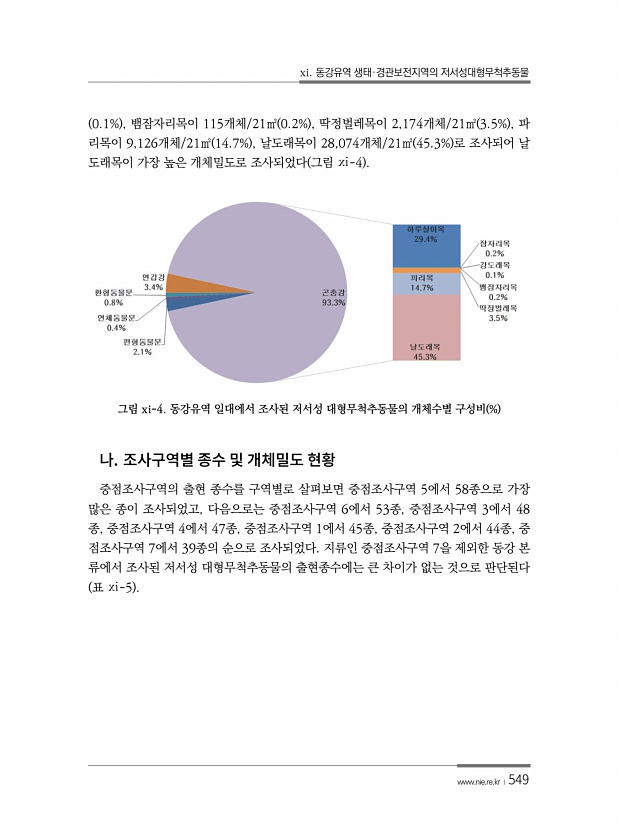 xi. 동강유역 생태·경관보전지역의 저서성대형무척추동물 www.nie.re.kr ?549 0.1% , 뱀잠자리목이 115개체/21㎡ 0.2% , 딱정벌레목이 2,174개체/21㎡ 3.5% , 파 리목이 9,126개체/21㎡ 14.7% , 날도래목이 28,074개체/21㎡ 45.3% 로 조사되어 날 도래목이 가장 높은 개체밀도로 조사되었다 그림 ?-4 그림 xi-4. 동강유역 일대에서 조사된 저서성 대형무척추동물의 개체수별 구성비 % 중점조사구역의 출현 종수를 구역별로 살펴보면 중점조사구역 5에서 58종으로 가장 많은 종이 조사되었고, 다음으로는 중점조사구역 6에서 53종, 중점조사구역 3에서 48 종, 중점조사구역 4에서 47종, 중점조사구역 1에서 45종, 중점조사구역 2에서 44종, 중 점조사구역 7에서...