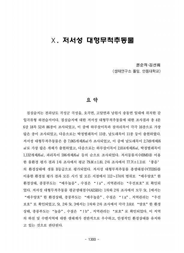 1300 Ⅹ. 저서성 대형무척추동물 권순직·김선희 생태연구소 풀잎, 안동대학교 요 약 침실습지는 전라남도 곡성군 곡성읍, 오곡면, 고달면과 남원시 송동면 일대에 위치한 감 입곡류형 하천습지이다. 침실습지에 대한 저서성 대형무척추동물에 대한 조사결과 총 4문 6강 18목 52과 86종이 조사되었고, 이 중에 하루살이목과 잠자리목이 각각 16종으로 가장 많은 종이 조사되었고, 다음으로는 딱정벌레목이 13종, 날도래목이 11종 등이 출현하였다. 저서성 대형무척추동물은 총 7,065개체/6㎡가 조사되었고, 이 중에 날도래목이 2,749개체/6 ㎡로 가장 많은 개체가 출현하였고, 다음으로는 하루살이목이 2,014개체/6㎡, 딱정벌레목이 1,132개체/6㎡, 파리목이 596개체/6㎡ 등의 순으로 조사되었다. 저서동물지...