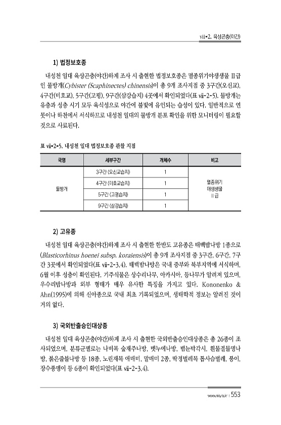 vii-2. 육상곤충 야간 www.nie.re.kr ?553 1 내성천 일대 육상곤충 야간 하계 조사 시 출현한 법정보호종은 멸종위기야생생물 Ⅱ급 인 물방개 Cybister Scaphinectes chinensis 이 총 9개 조사지점 중 3구간 오신교 , 4구간 미호교 , 5구간 고평 , 9구간 삼강습지 4곳에서 확인되었다 표 ⅶ-2-5 물방개는 유충과 성충 시기 모두 육식성으로 야간에 불빛에 유인되는 습성이 있다. 일반적으로 연 못이나 하천에서 서식하므로 내성천 일대의 물방개 분포 확인을 위한 모니터링이 필요할 것으로 사료된다. 국명 세부구간 개체수 비고 물방개 3구간 오신교습지 1 멸종위기 야생생물 Ⅱ급 4구간 미호교습지 1 5구간 고평습지 1 9구간 삼강습지 1 표 ⅶ-2-5. 내성천 일대 법정보호종...