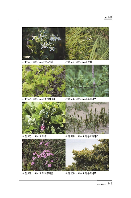 V. 부 록 www.nie.re.kr ?547 사진 593. 소허사도의 참으아리 사진 594. 소허사도의 참취 사진 595. 소허사도의 청미래덩굴 사진 596. 소허사도의 초피나무 사진 597. 소허사도의 칡 사진 598. 소허사도의 통보리사초 사진 599. 소허사도의 패랭이꽃 사진 600. 소허사도의후박나무