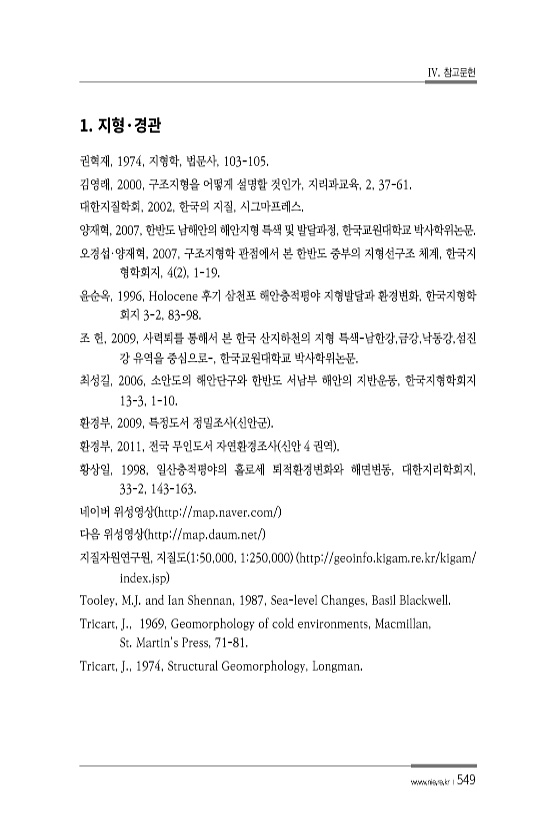 IV. 참고문헌 www.nie.re.kr ?549 1. · 권혁재, 1974, 지형학, 법문사, 103-105. 김영래, 2000, 구조지형을 어떻게 설명할 것인가, 지리과교육, 2, 37-61. 대한지질학회, 2002, 한국의 지질, 시그마프레스. 양재혁, 2007, 한반도 남해안의 해안지형 특색 및 발달과정, 한국교원대학교 박사학위논문. 오경섭·양재혁, 2007, 구조지형학 관점에서 본 한반도 중부의 지형선구조 체계, 한국지 형학회지, 4 2 , 1-19. 윤순옥, 1996, Holocene 후기 삼천포 해안충적평야 지형발달과 환경변화, 한국지형학 회지 3-2, 83-98. 조 헌, 2009, 사력퇴를 통해서 본 한국 산지하천의 지형 특색-남한강,금강,낙동강,섬진 강 유역을 중심으로-, 한국교원대학교 박...