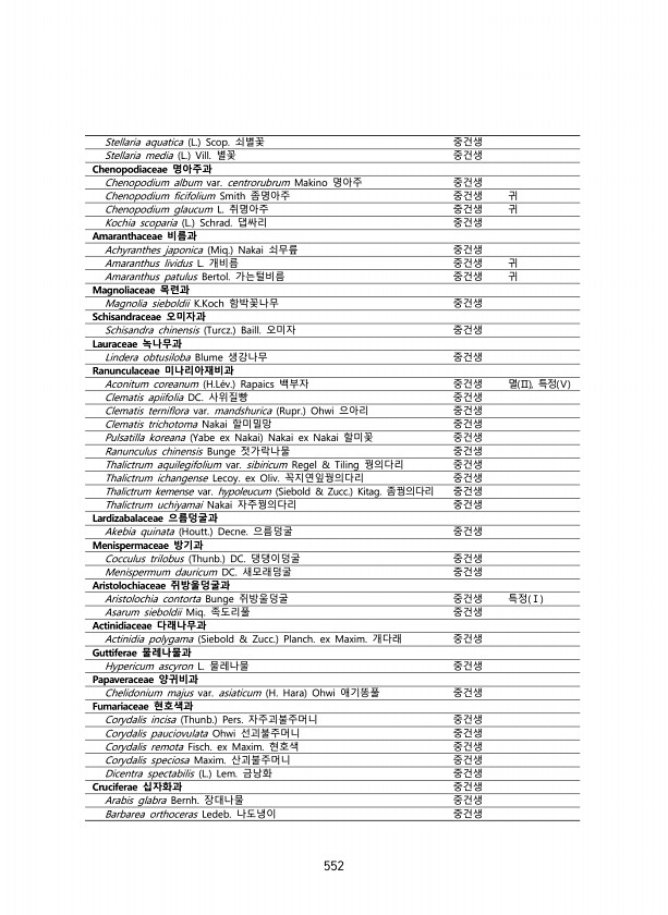 552 Stellaria aquatica L. Scop. 쇠별꽃 중건생 Stellaria media L. Vill. 별꽃 중건생 Chenopodiaceae 명아주과 Chenopodium album var. centrorubrum Makino 명아주 중건생 Chenopodium ficifolium Smith 좀명아주 중건생 귀 Chenopodium glaucum L. 취명아주 중건생 귀 Kochia scoparia L. Schrad. 댑싸리 중건생 Amaranthaceae 비름과 Achyranthes japonica Miq. Nakai 쇠무릎 중건생 Amaranthus lividus L. 개비름 중건생 귀 Amaranthus patulus Bertol. 가는털비름 중건생 귀 Magnoliaceae 목련과 Ma...