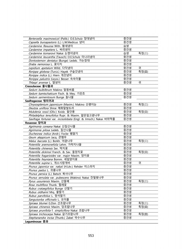 553 Berteroella maximowiczii Palib. O.E.Schulz 장대냉이 중건생 Capsella bursapastoris L. L.W.Medicus 냉이 중건생 Cardamine flexuosa With. 황새냉이 습생 Cardamine impatiens L. 싸리냉이 중건생 Cardamine komarovii Nakai 는쟁이냉이 습생 특정 Ⅰ Cardamine leucantha Tausch O.E.Schulz 미나리냉이 중건생 Dontostemon dentatus Bunge Ledeb. 가는장대 중건생 Draba nemorosa L. 꽃다지 중건생 Lepidium apetalum Willd. 다닥냉이 중건생 귀 Rorippa globosa Turcz. Hayek 구슬갓냉이 중건생 특정...