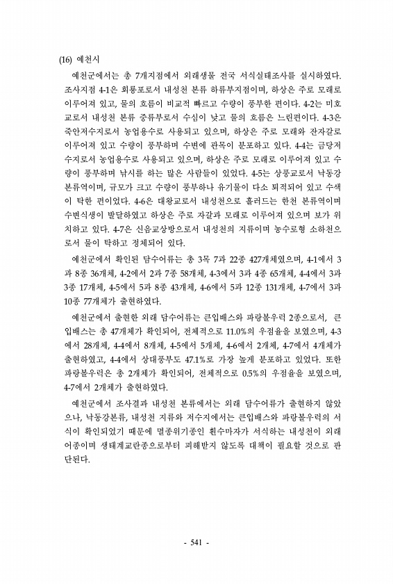 16 예천시 예천군에서는 총 7개지점에서 외래생물 전국 서식실태조사를 실시하였다. 조사지점 4-1은 회룡포로서 내성천 본류 하류부지점이며, 하상은 주로 모래로 이루어져 있고, 물의 흐름이 비교적 빠르고 수량이 풍부한 편이다. 4-2는 미호 교로서 내성천 본류 중류부로서 수심이 낮고 물의 흐름은 느린편이다. 4-3은 죽안저수지로서 농업용수로 사용되고 있으며, 하상은 주로 모래와 잔자갈로 이루어져 있고 수량이 풍부하며 수변에 관목이 분포하고 있다. 4-4는 금당저 수지로서 농업용수로 사용되고 있으며, 하상은 주로 모래로 이루어져 있고 수 량이 풍부하며 낚시를 하는 많은 사람들이 있었다. 4-5는 상풍교로서 낙동강 본류역이며, 규모가 크고 수량이 풍부하나 유기물이 다소 퇴적되어 있고 수색 이 탁한 편이었다. 4-...