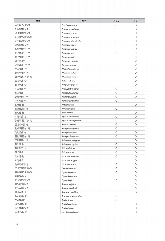 564 곧은띠꼬마밤나방 Ozarba punctigera ○ ○ 은무늬짤름나방 Pangrapta costinotata ○ 수풀알락짤름나방 Pangrapta griseola ○ 산그물무늬짤름나방 Pangrapta perturbans ○ 연무늬끝짤름나방 Pangrapta trimantesalis ○ ○ 점박이짤름나방 Pangrapta vasava ○ 노랑무늬수염나방 Paracolax contigua ○ 흰점보라수염나방 Paracolax pryeri ○ ○ 외점박이수염나방 Paracolax sugii ○ 줄수염나방 Paracolax trilinealis ○ 점분홍꼬마밤나방 Perynea subrosea ○ 쑥꼬마밤나방 Phyllophila obliterata ○ 좁쌀무늬밤나방 Platysenta cyclica ○ ...