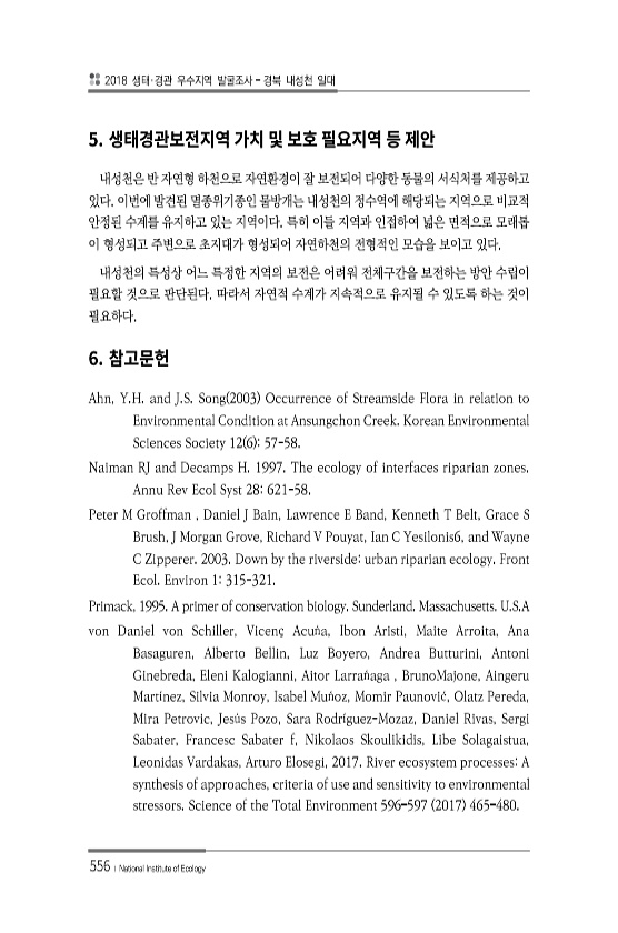 2018 생태·경관 우수지역 발굴조사 경북 내성천 일대 556 ? National Institute of Ecology 5. 내성천은 반 자연형 하천으로 자연환경이 잘 보전되어 다양한 동물의 서식처를 제공하고 있다. 이번에 발견된 멸종위기종인 물방개는 내성천의 정수역에 해당되는 지역으로 비교적 안정된 수계를 유지하고 있는 지역이다. 특히 이들 지역과 인접하여 넓은 면적으로 모래톱 이 형성되고 주변으로 초지대가 형성되어 자연하천의 전형적인 모습을 보이고 있다. 내성천의 특성상 어느 특정한 지역의 보전은 어려워 전체구간을 보전하는 방안 수립이 필요할 것으로 판단된다. 따라서 자연적 수계가 지속적으로 유지될 수 있도록 하는 것이 필요하다. 6. Ahn, Y.H. and J.S. Song 2003 Occurrenc...