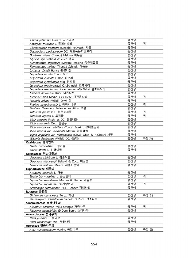 554 Albizia julibrissin Durazz. 자귀나무 중건생 Amorpha fruticosa L. 족제비싸리 중건생 귀 Chamaecrista nomame Siebold H.Ohashi 차풀 중건생 Desmodium podocarpum DC. 개도둑놈의갈고리 중건생 Dunbaria villosa Thunb. Makino 여우팥 중건생 Glycine soja Siebold & Zucc. 돌콩 중건생 Kummerowia stipulacea Maxim. Makino 둥근매듭풀 중건생 Kummerowia striata Thunb. Schindl. 매듭풀 중건생 Lathyrus davidii Hance 활량나물 중건생 Lespedeza bicolor Turcz. 싸리 중건생 Lespedeza cuneat...