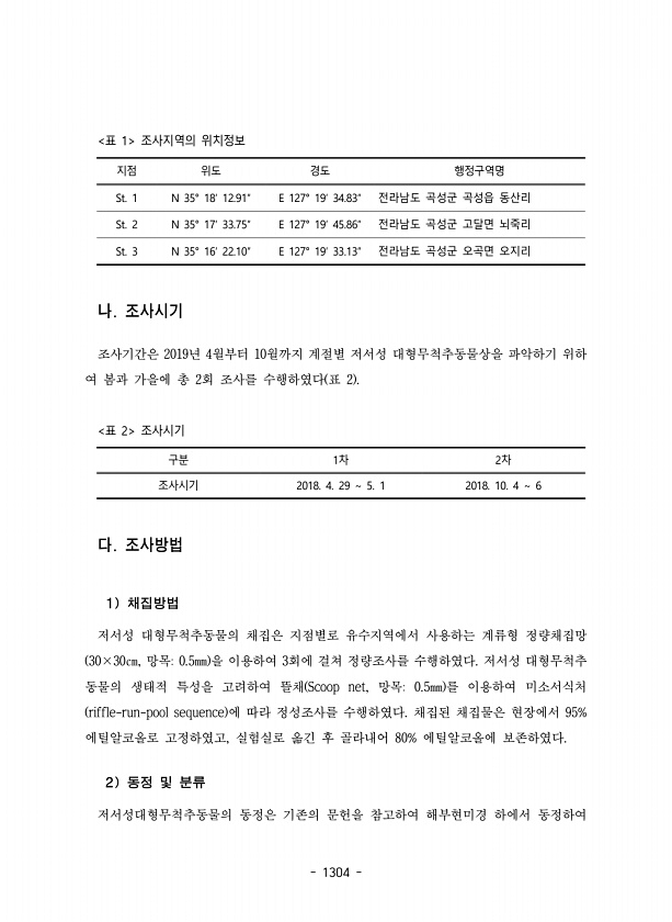 1304 지점 위도 경도 행정구역명 St. 1 N 35° 18′ 12.91″ E 127° 19′ 34.83″ 전라남도 곡성군 곡성읍 동산리 St. 2 N 35° 17′ 33.75″ E 127° 19′ 45.86″ 전라남도 곡성군 고달면 뇌죽리 St. 3 N 35° 16′ 22.10″ E 127° 19′ 33.13″ 전라남도 곡성군 오곡면 오지리 표 1 조사지역의 위치정보 나. 조사시기 조사기간은 2019년 4월부터 10월까지 계절별 저서성 대형무척추동물상을 파악하기 위하 여 봄과 가을에 총 2회 조사를 수행하였다 표 2 구분 1차 2차 조사시기 2018. 4. 29 ∼ 5. 1 2018. 10. 4 ∼ 6 표 2 조사시기 다. 조사방법 1 채집방법 저서성 대형무척추동물의 채집은 지점별로 유수지역에서 사용하는...