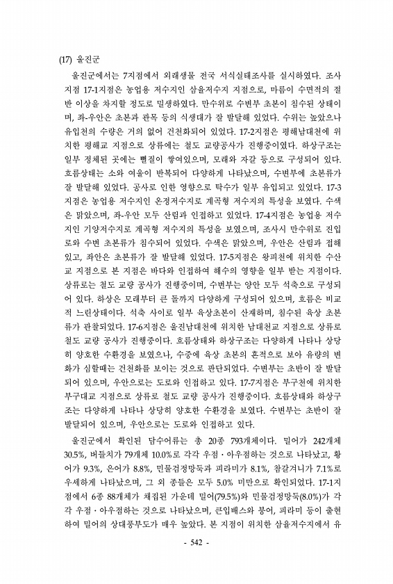 17 울진군 울진군에서는 7지점에서 외래생물 전국 서식실태조사를 실시하였다. 조사 지점 17-1지점은 농업용 저수지인 삼율저수지 지점으로, 마름이 수면적의 절 반 이상을 차지할 정도로 밀생하였다. 만수위로 수변부 초본이 침수된 상태이 며, 좌-우안은 초본과 관목 등의 식생대가 잘 발달해 있었다. 수위는 높았으나 유입천의 수량은 거의 없어 건천화되어 있었다. 17-2지점은 평해남대천에 위 치한 평해교 지점으로 상류에는 철도 교량공사가 진행중이였다. 하상구조는 일부 정체된 곳에는 뻘질이 쌓여있으며, 모래와 자갈 등으로 구성되어 있다. 흐름상태는 소와 여울이 반복되어 다양하게 나타났으며, 수변부에 초본류가 잘 발달해 있었다. 공사로 인한 영향으로 탁수가 일부 유입되고 있었다. 17-3 지점은 농업용 저수지인 온정...