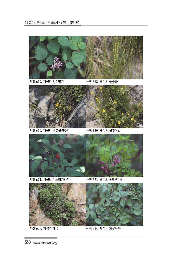 2018 특정도서 정밀조사 신안 1 북부권역 550 ? National Institute of Ecology 사진 617. 대섬의 멍석딸기 사진 618. 대섬의 물골풀 사진 619. 대섬의 백운산원추리 사진 620. 대섬의 선괭이밥 사진 621. 대섬의 이스라지나무 사진 622. 대섬의 좀땅비싸리 사진 623. 대섬의 해국 사진 624. 대섬의화살나무