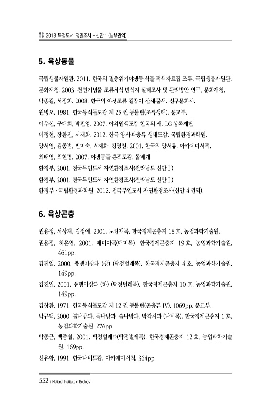 2018 특정도서 정밀조사 신안 1 남부권역 552 ? National Institute of Ecology 5. 국립생물자원관. 2011. 한국의 멸종위기야생동?식물 적색자료집 조류. 국립생물자원관. 문화재청. 2003. 천연기념물 조류서식?번식지 실태조사 및 관리방안 연구, 문화재청. 박종길, 서정화. 2008. 한국의 야생조류 길잡이 산새?물새. 신구문화사. 원병오. 1981. 한국동식물도감 제 25 권 동물편 조류생태 문교부. 이우신, 구태회, 박진영. 2007. 야외원색도감 한국의 새. LG 상록재단. 이정현, 장환진, 서재화. 2012. 한국 양서?파충류 생태도감. 국립환경과학원. 양서영, 김종범, 민미숙, 서재화, 강영진. 2001. 한국의 양서류. 아카데미서적. 최태영, 최현명. 2007. 야...