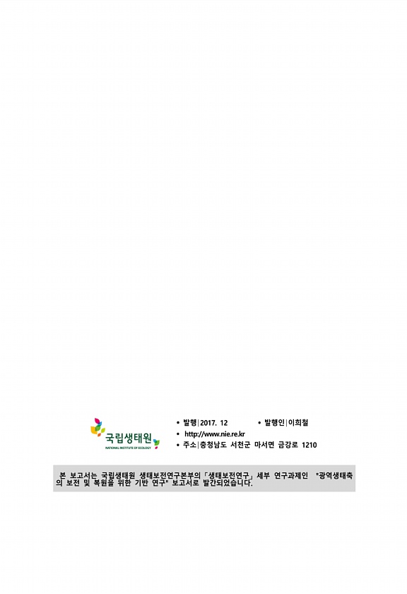 ? 발행 2017. 12 ? 발행인 이희철 ? http//www.nie.re.kr ? 주소 충청남도 서천군 마서면 금강로 1210 본 보고서는 국립생태원 생태보전연구본부의 생태보전연구 세부 연구과제인 광역생태축 의 보전 및 복원을 위한 기반 연구보고서로발간되었습니다.