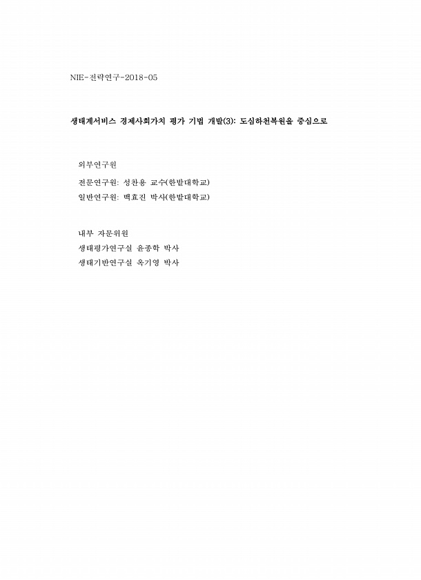 NIE-전략연구-2018-05 생태계서비스 경제사회가치 평가 기법 개발 3 도심하천복원을 중심으로 외부연구원 전문연구원성찬용 교수 한밭대학교 일반연구원백효진 박사 한밭대학교 내부 자문위원 생태평가연구실 윤종학 박사 생태기반연구실 옥기영박사