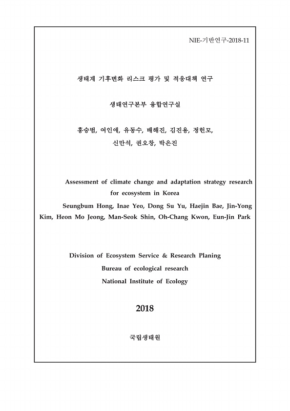 NIE-? -2018-11 ? , , , , ? , , , , Assessment of climate change and adaptation strategy research for ecosystem in Korea Seungbum Hong, Inae Yeo, Dong Su Yu, Haejin Bae, Jin-Yong Kim, Heon Mo Jeong, Man-Seok Shin, Oh-Chang Kwon, Eun-Jin Park Division of Ecosystem Service & Research Planing Bureau of ecological research National Institute of Ecology 2018