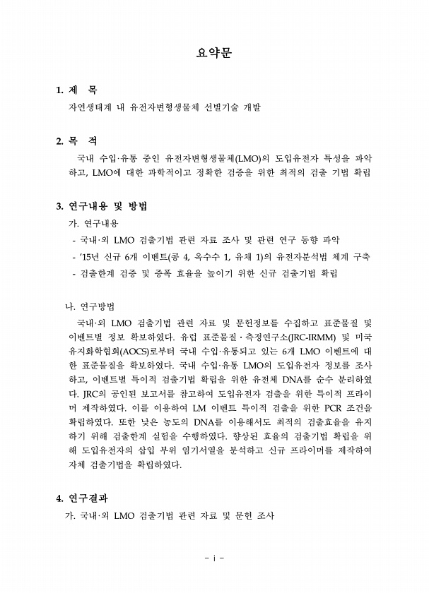 요약문 1. 제 목 자연생태계 내 유전자변형생물체 선별기술 개발 2. 목 적 국내 수입·유통 중인 유전자변형생물체 LMO 의 도입유전자 특성을 파악 하고, LMO에 대한 과학적이고 정확한 검증을 위한 최적의 검출 기법 확립 3. 연구내용 및 방법 가. 연구내용 국내·외 LMO 검출기법 관련 자료 조사 및 관련 연구 동향 파악 ’15년 신규 6개 이벤트 콩 4, 옥수수 1, 유채 1 의 유전자분석법 체계 구축 검출한계 검증 및 증폭 효율을 높이기 위한 신규 검출기법 확립 나. 연구방법 국내·외 LMO 검출기법 관련 자료 및 문헌정보를 수집하고 표준물질 및 이벤트별 정보 확보하였다. 유럽 표준물질?측정연구소 JRC-IRMM 및 미국 유지화학협회 AOCS 로부터 국내 수입·유통되고 있는 6개 LMO 이벤트에 대 ...