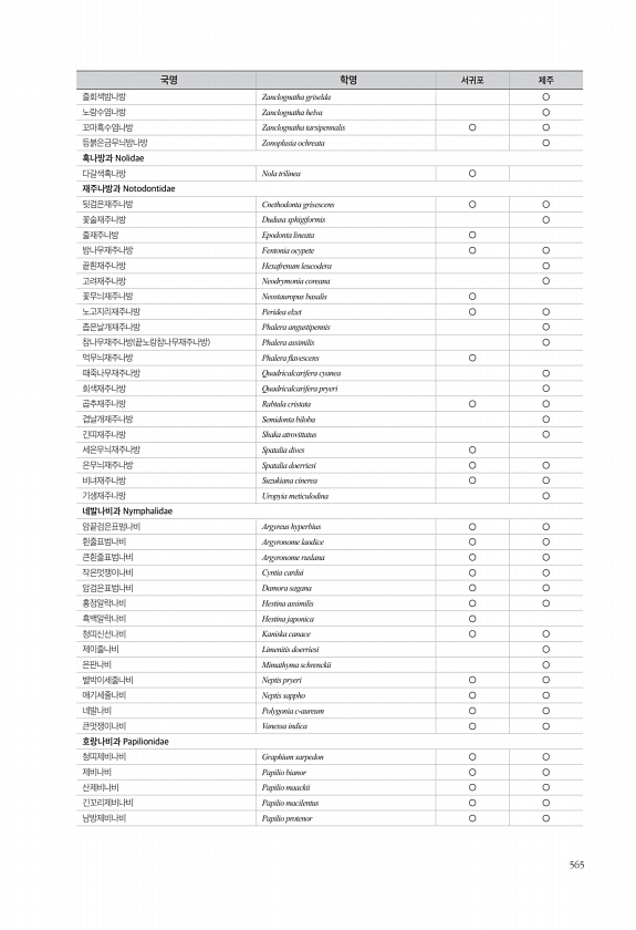 565 줄회색밤나방 Zanclognatha griselda ○ 노랑수염나방 Zanclognatha helva ○ 꼬마혹수염나방 Zanclognatha tarsipennalis ○ ○ 등붉은금무늬밤나방 Zonoplusia ochreata ○ 혹나방과 Nolidae 다갈색혹나방 Nola trilinea ○ 재주나방과 Notodontidae 뒷검은재주나방 Cnethodonta grisescens ○ ○ 꽃술재주나방 Dudusa sphigiformis ○ 줄재주나방 Epodonta lineata ○ 밤나무재주나방 Fentonia ocypete ○ ○ 끝흰재주나방 Hexafrenum leucodera ○ 고려재주나방 Neodrymonia coreana ○ 꽃무늬재주나방 Neostauropus basalis ○ 노고지...