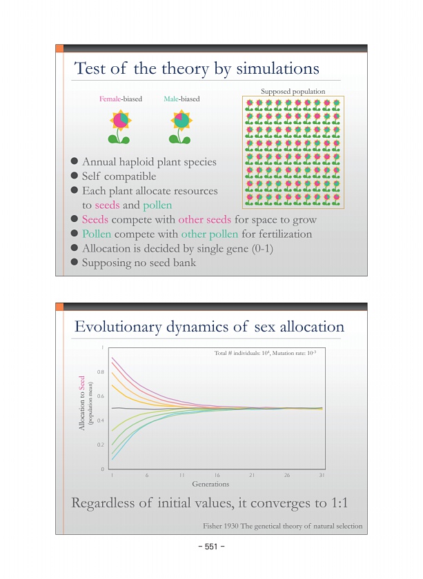 Evolutionary dynamics of sex allocation Allocation to Seed population mean Generations Total # individuals104, Mutation rate10-3 Regardless of initial values, it converges to 11 Fisher 1930 The genetical theory of natural selection 0 0.2 0.4 0.6 0.8 1 1 6 11 16 21 26 31 Test of the theory by simulations ? Annual haploid plant species ? Self compatible ? Each plant allocate resources to seeds and p...