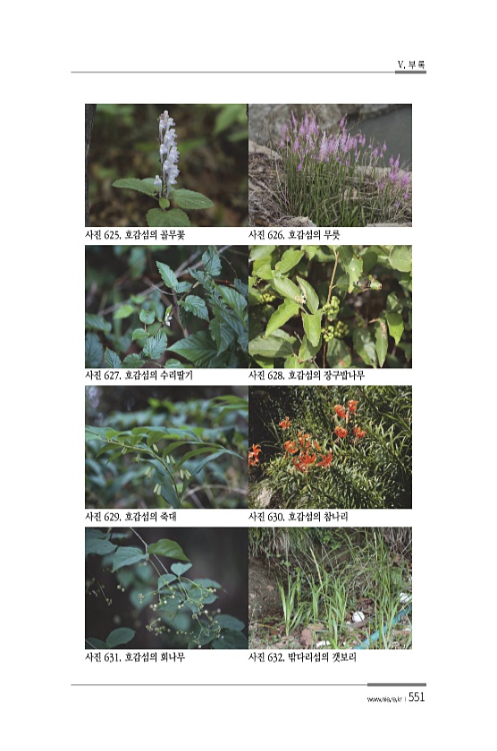 V. 부 록 www.nie.re.kr ?551 사진 625. 호감섬의 골무꽃 사진 626. 호감섬의 무릇 사진 627. 호감섬의 수리딸기 사진 628. 호감섬의 장구밥나무 사진 629. 호감섬의 죽대 사진 630. 호감섬의 참나리 사진 631. 호감섬의 회나무 사진 632. 밖다리섬의갯보리