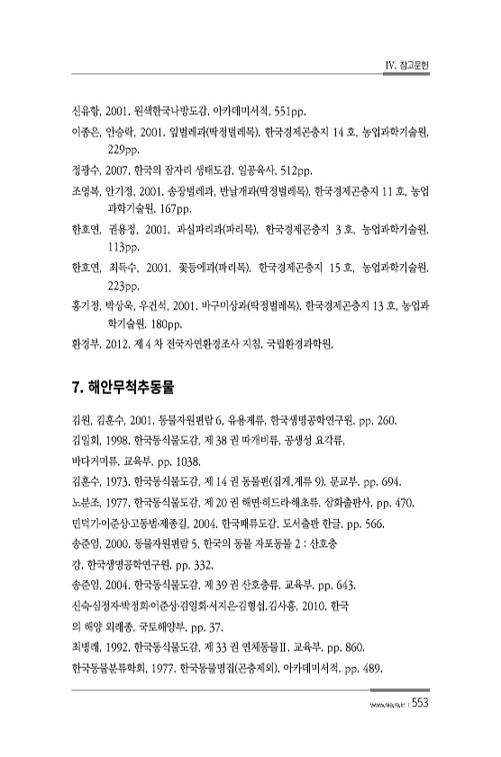 IV. 참고문헌 www.nie.re.kr ?553 신유항, 2001. 원색한국나방도감. 아카데미서적, 551pp. 이종은, 안승락, 2001. 잎벌레과 딱정벌레목 한국경제곤충지 14 호, 농업과학기술원. 229pp. 정광수, 2007. 한국의 잠자리 생태도감. 일공육사, 512pp. 조영복, 안기정, 2001. 송장벌레과, 반날개과 딱정벌레목 한국경제곤충지 11 호, 농업 과학기술원. 167pp. 한호연, 권용정, 2001. 과실파리과 파리목 한국경제곤충지 3 호, 농업과학기술원. 113pp. 한호연, 최득수, 2001. 꽃등에과 파리목 한국경제곤충지 15 호, 농업과학기술원. 223pp. 홍기정, 박상욱, 우건석, 2001. 바구미상과 딱정벌레목 한국경제곤충지 13 호, 농업과 학기술원. 180pp. 환경...