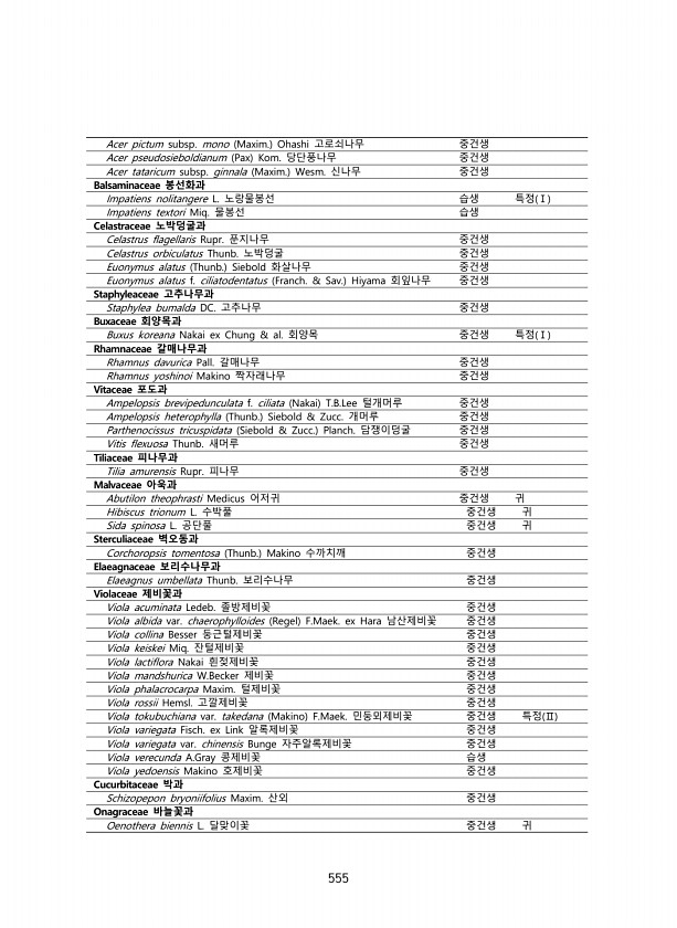 555 Acer pictum subsp. mono Maxim. Ohashi 고로쇠나무 중건생 Acer pseudosieboldianum Pax Kom. 당단풍나무 중건생 Acer tataricum subsp. ginnala Maxim. Wesm. 신나무 중건생 Balsaminaceae 봉선화과 Impatiens nolitangere L. 노랑물봉선 습생 특정 Ⅰ Impatiens textori Miq. 물봉선 습생 Celastraceae 노박덩굴과 Celastrus flagellaris Rupr. 푼지나무 중건생 Celastrus orbiculatus Thunb. 노박덩굴 중건생 Euonymus alatus Thunb. Siebold 화살나무 중건생 Euonymus alatus f. ciliatodentat...