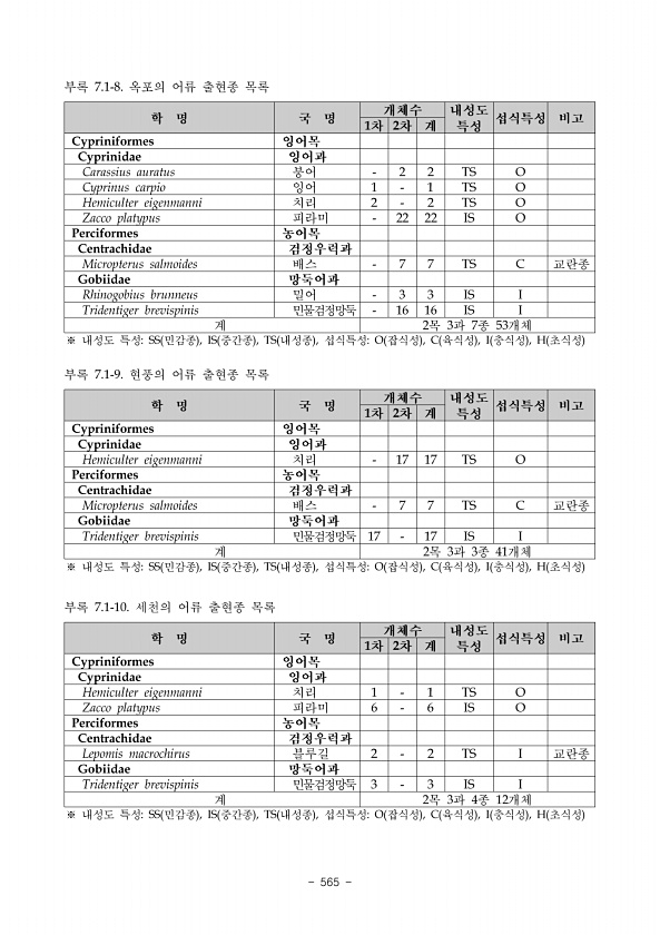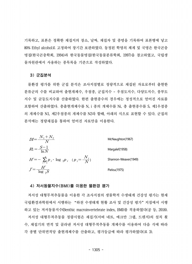 1305 기록하고, 표본은 정확한 채집지의 장소, 날짜, 채집자 및 종명을 기록하여 표본병에 넣고 80% Ethyl alcohol로 고정하여 장기간 보관하였다. 동정된 학명의 체계 및 국명은 한국곤충 명집 한국곤충학회, 1994 과 한국동물명집 한국동물분류학회, 1997 을 참고하였고, 국립생 물자원관에서 사용하는 종목록을 기준으로 작성하였다. 3 군집분석 물환경 평가를 위한 군집 분석은 조사지점별로 정량적으로 채집된 자료로부터 출현한 분류군의 수를 비교하여 출현개체수, 우점종, 군집지수 우점도지수, 다양도지수, 풍부도 지수 및 균등도지수를 산출하였다. 한편 출현종수의 경우에는 정성적으로 얻어진 자료를 포함하여 산출하였다. 총출현개체수를 N, i 종의 개체수를 Ni, 총 출현종수를 S, 제1우점종 의 개체수...