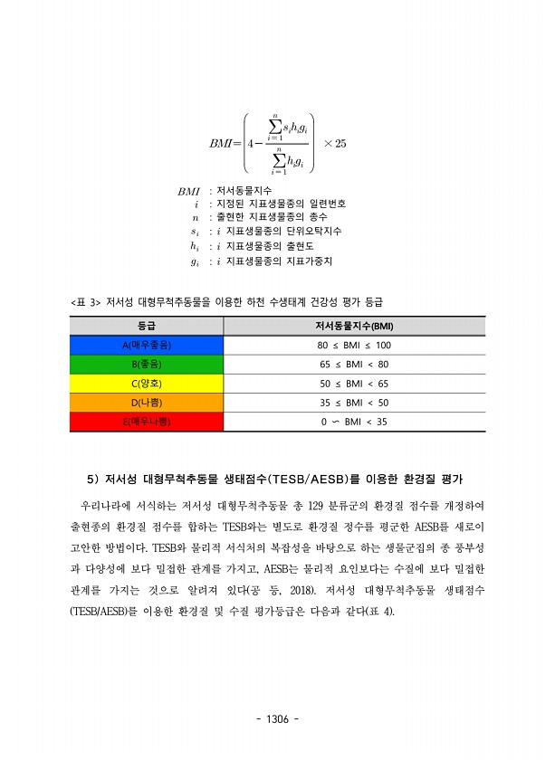 1306 ?? ? ??? ?? ? ????? × 저서동물지수 ? 지정된 지표생물종의 일련번호 ? 출현한 지표생물종의 총수 ?? ? 지표생물종의 단위오탁지수 ?? ? 지표생물종의 출현도 ?? ? 지표생물종의 지표가중치 등급 저서동물지수 BMI A 매우좋음 80 ≤ BMI ≤ 100 B 좋음 65 ≤ BMI 80 C 양호 50 ≤ BMI 65 D 나쁨 35 ≤ BMI 50 E 매우나쁨 0 ? BMI 35 표 3 저서성 대형무척추동물을 이용한 하천 수생태계 건강성 평가 등급 5 저서성 대형무척추동물 생태점수 TESB/AESB 를 이용한 환경질 평가 우리나라에 서식하는 저서성 대형무척추동물 총 129 분류군의 환경질 점수를 개정하여 출현종의 환경질 점수를...