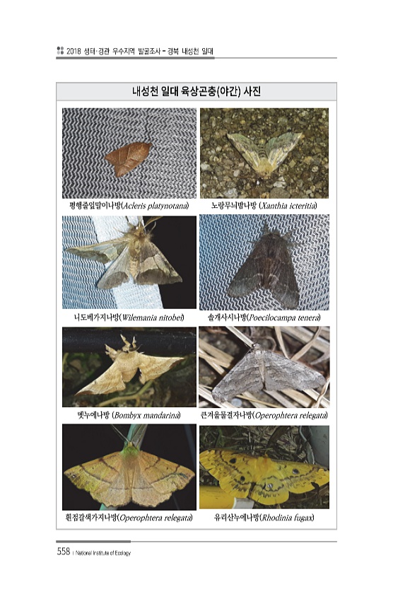 2018 생태·경관 우수지역 발굴조사 경북 내성천 일대 558 ? National Institute of Ecology 평행줄잎말이나방 Acleris platynotana 노랑무늬밤나방 Xanthia icteritia 니도베가지나방 Wilemania nitobei 솔개사시나방 Poecilocampa tenera 멧누에나방 Bombyx mandarina 큰겨울물결자나방 Operophtera relegata 흰점갈색가지나방 Operophtera relegata 유리산누에나방 Rhodinia fugax