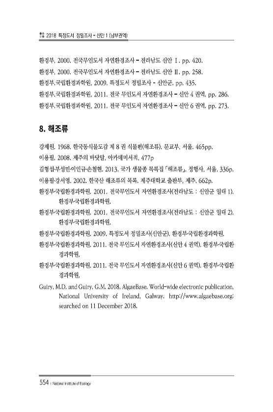 2018 특정도서 정밀조사 신안 1 남부권역 554 ? National Institute of Ecology 환경부, 2000. 전국무인도서 자연환경조사 ? 전라남도 신안 Ⅰ. pp. 420. 환경부, 2000. 전국무인도서 자연환경조사 ? 전라남도 신안 Ⅱ. pp. 258. 환경부.국립환경과학원, 2009. 특정도서 정밀조사 신안군. pp. 435. 환경부.국립환경과학원, 2011. 전국 무인도서 자연환경조사 ? 신안 4 권역. pp. 286. 환경부.국립환경과학원, 2011. 전국 무인도서 자연환경조사 ? 신안 6 권역. pp. 273. 8. 강제원. 1968. 한국동식물도감 제 8 권 식물편 해조류 문교부, 서울. 465pp. 이용필. 2008. 제주의 바닷말, 아카데미서적, 477p 김형섭?부성민?이...