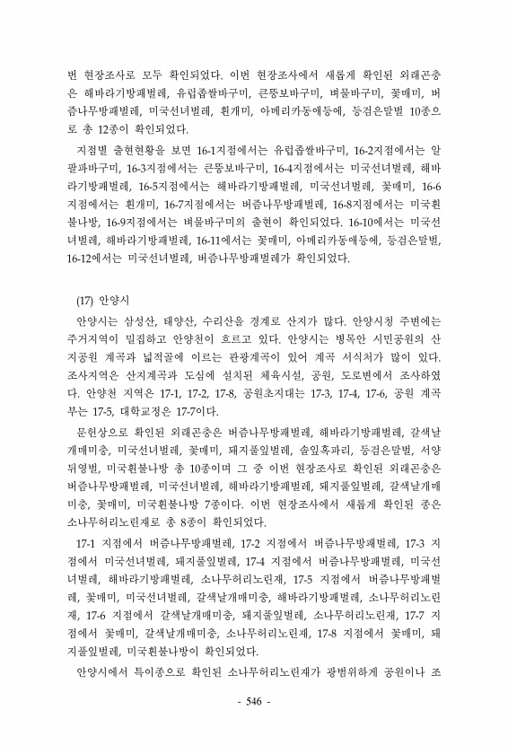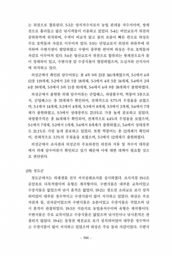 는 위천으로 합류된다. 5-3은 양지저수지로서 농업 관개용 저수지이며, 쌍계 천으로 흘러들고 많은 낚시객들이 이용하고 있었다. 5-4는 비안교로서 위천의 중하류역에 위치하며, 수색이 비교적 맑고 물의 흐름이 빠른 편으로 하상은 주로 호박돌과 자갈로 이루어져 있다. 5-5는 단밀교로서 위천의 하류부에 위 치하며 수변식생이 발달하였고 수량이 풍부한 편이며 하상은 주로 호박돌과 자갈로 이루어져 있다. 5-6은 탑산교로서 위천으로 합류되는 쌍계천으로서 물 이 정체되어 있고, 수변식생 및 수중식물이 발달하였으며, 도심지와 산지사이 에 위치하고 있다. 의성군에서 확인된 담수어류는 총 4목 9과 23종 361개체였으며, 5-1에서 6과 12종 119개체, 5-2에서 2과 5종 18개체, 5-3에서 4과 5종 34개체, ...