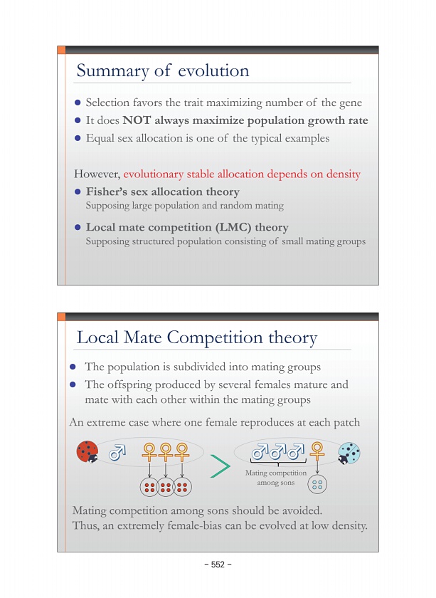 Local Mate Competition theory ? The population is subdivided into mating groups ? The offspring produced by several females mature and mate with each other within the mating groups An extreme case where one female reproduces at each patch Mating competition among sons should be avoided. Thus, an extremely female-bias can be evolved at low density. Mating competition among sons Summary of evolution...