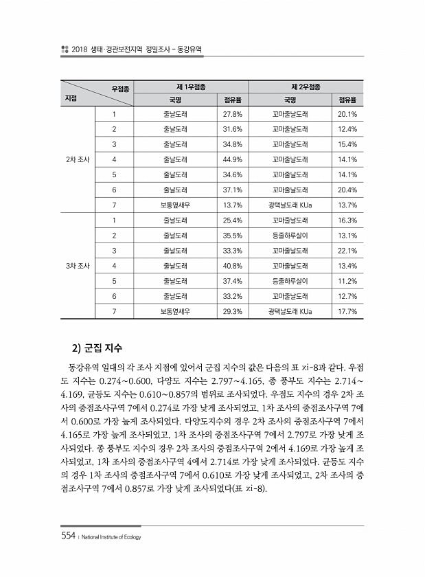 2018 생태·경관보전지역 정밀조사 동강유역 554 ? National Institute of Ecology 2 동강유역 일대의 각 조사 지점에 있어서 군집 지수의 값은 다음의 표 ?-8과 같다. 우점 도 지수는 0.274∼0.600, 다양도 지수는 2.797∼4.165, 종 풍부도 지수는 2.714∼ 4.169, 균등도 지수는 0.610∼0.857의 범위로 조사되었다. 우점도 지수의 경우 2차 조 사의 중점조사구역 7에서 0.274로 가장 낮게 조사되었고, 1차 조사의 중점조사구역 7에 서 0.600로 가장 높게 조사되었다. 다양도지수의 경우 2차 조사의 중점조사구역 7에서 4.165로 가장 높게 조사되었고, 1차 조사의 중점조사구역 7에서 2.797로 가장 낮게 조 사되었다. 종 풍부도 지수의 경우 2차...