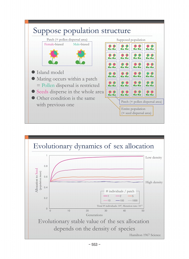 Evolutionary dynamics of sex allocation Allocation to Seed population mean Generations Evolutionary stable value of the sex allocation depends on the density of species 0 0.2 0.4 0.6 0.8 1 0 10 20 30 40 50 1 2 5 10 100 1000 # individuals patch Total # individuals104, Mutation rate10-3 Low density High density Hamilton 1967 Science Suppose population structure Female-biased Male-biased Patch = poll...
