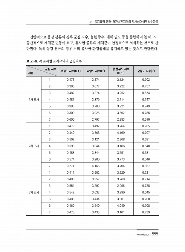 xi. 동강유역 생태·경관보전지역의 저서성대형무척추동물 www.nie.re.kr ?555 전반적으로 동강 본류의 경우 군집 지수, 출현 종수, 개체 밀도 등을 종합하여 볼 때, 시· 공간적으로 개체군 변동이 적고, 유사한 종류의 개체군이 안정적으로 서식하는 것으로 판 단된다. 특히 동강 본류의 경우 거의 유사한 환경상태를 유지하고 있는 것으로 판단된다. 군집 지수 지점 우점도 지수 D.I. 다양도 지수 H종 풍부도 지수 R.1. 균등도 지수 J1차 조사 1 0.478 3.374 3.124 0.702 2 0.395 3.677 3.222 0.757 3 0.482 3.274 3.252 0.674 4 0.481 3.379 2.714 0.747 5 0.395 3.780 3.921 0.749 6 0.309 3.925 ...